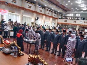 “Satu, undang-undang nomor 23 tahun 2014 tentang pemerintahan daerah sebagaimana diubah terakhir dengan undang-undang nomor 6 tahun 2023. Dua, peraturan pemerintah nomor 12 tahun tentang pedoman penyusunan tata tertib dewan perwakilan rakyat daerah provinsi kabupaten dan kota,” ucapnya membacanya isi naskah pelantikan.