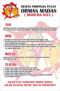 Ormas MADAS mempunyai Visi mendukung sepenuhnya pemerintahan yang sah dan program kerjanya secara institusional, serta membentuk warga Madura yang bermoral, bermartabat dan berakhlakul karimah.