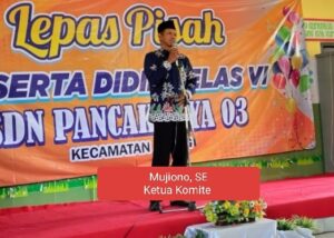 Sedangkan Mujiono, SE. Selaku Ketua Komite SDN Pancakarya 03 Mewakili para wali Murid Mengucapkan terimakasih Kepada guru guru Yang telah dengan sabar Mendidik anak anak kami sehingga mereka menjadi anak anak yang pintar dan lebih dewasa.