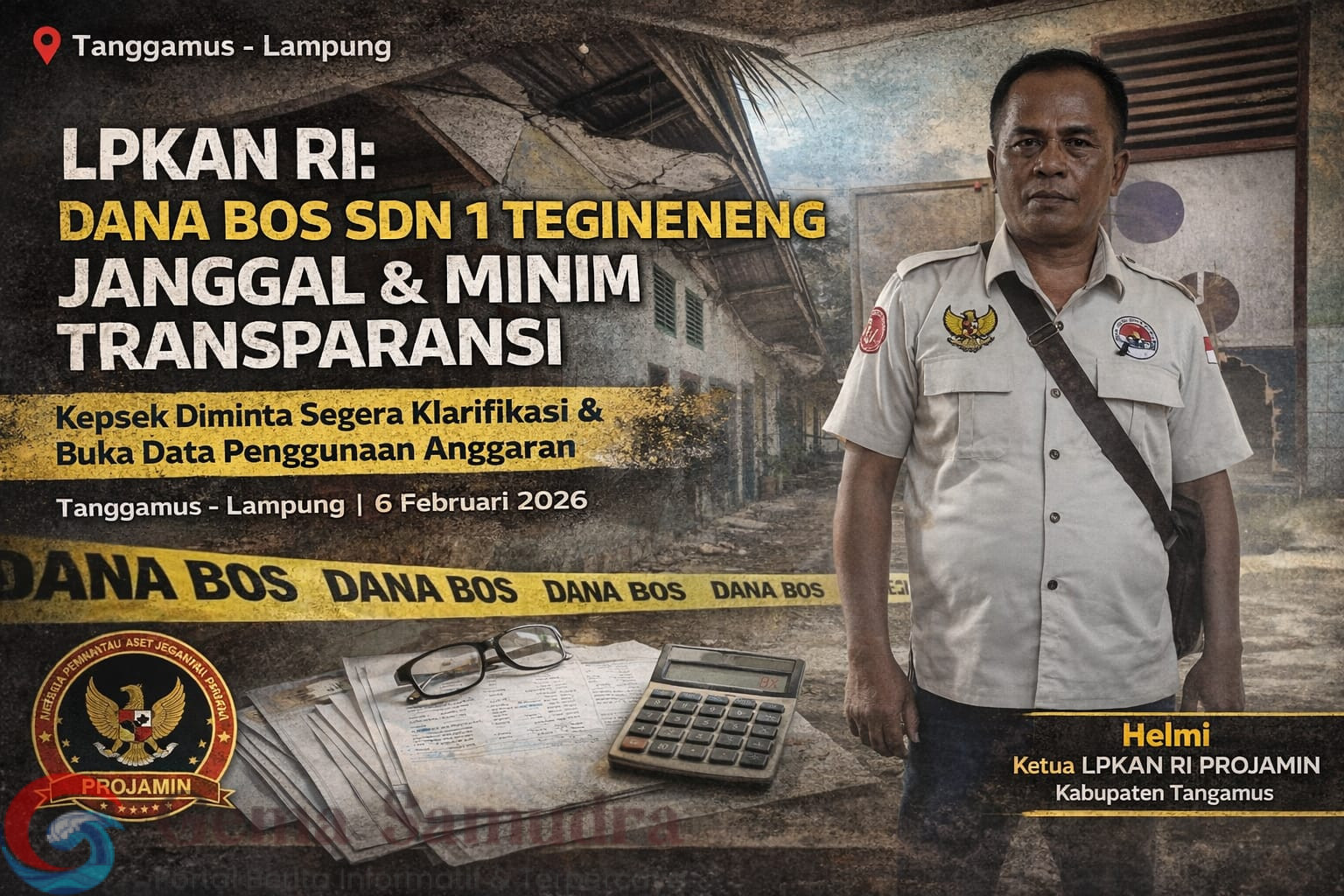 TANGGAMUS (GS) – Dugaan tidak adanya keterbukaan publik dalam pengelolaan Dana Bantuan Operasional Sekolah (BOS) Tahun Anggaran 2025 di SD Negeri 1 Tegineneng, Kecamatan Limau, Kabupaten Tanggamus, kini mendapat sorotan serius dari Lembaga Pemantau Aset Keuangan Negara Republik Indonesia (LPKAN RI PROJAMIN), Kamis (6/2/2026).