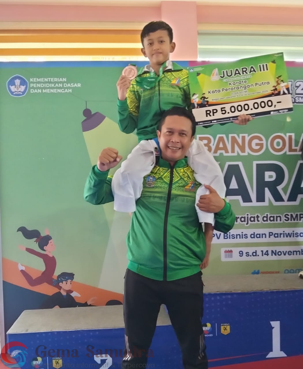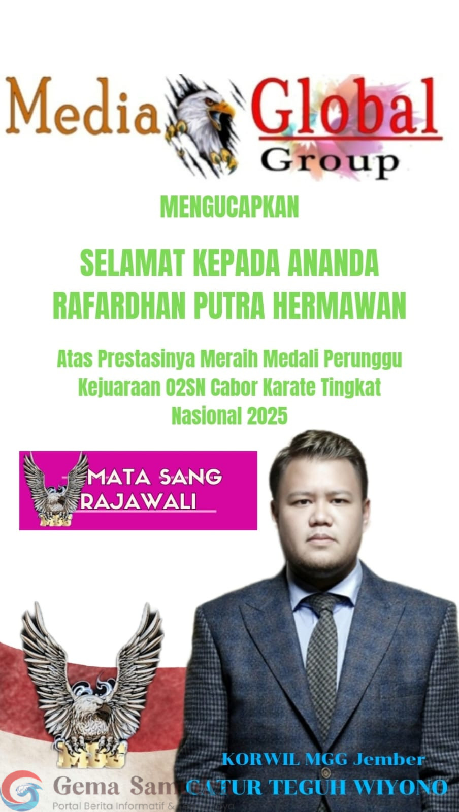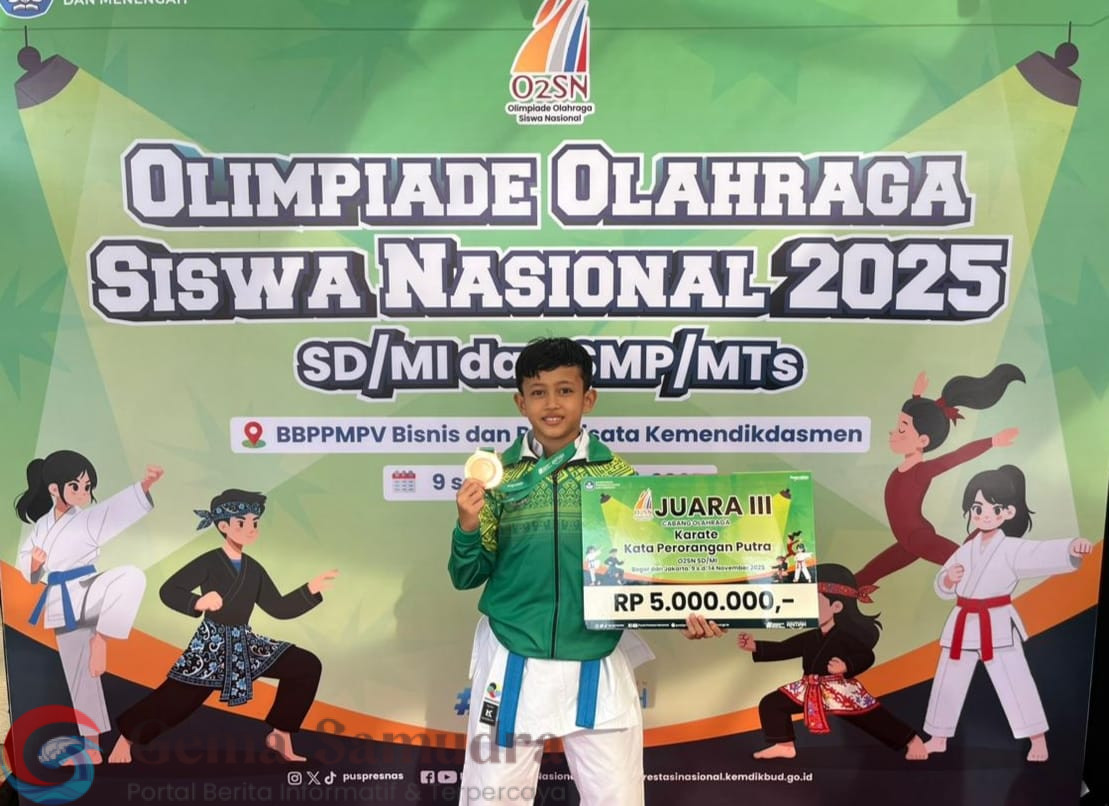 Jember, Gemasamudra.com — Manajemen Media Global (MGG) Jember menyampaikan ucapan selamat dan apresiasi kepada Rafardhan Putra Hermawan, siswa SDN Gumelar 01 Kecamatan Balung, yang berhasil meraih medali perunggu pada ajang Olimpiade Olahraga Siswa Nasional (O2SN) tingkat SD Cabor Karate Tahun 2025. Prestasi tersebut diraih dalam kompetisi yang diselenggarakan di Balai Besar Pengembangan Penjaminan Mutu Pendidikan Vokasi Bidang Pariwisata (BBPPVBP), Kota Depok, Jawa Barat, pada 10–14 November 2025.