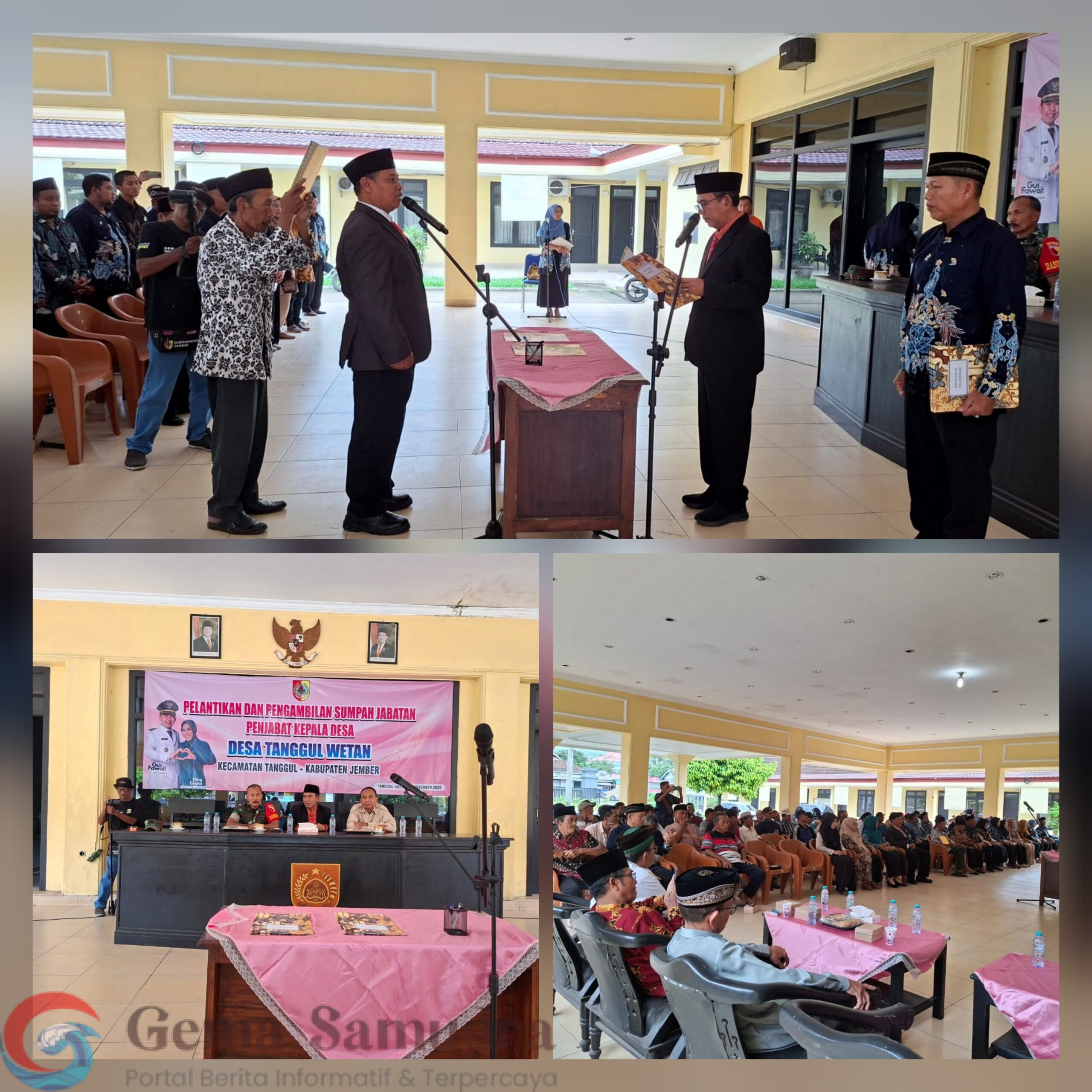 Jember, Gemasamudra.com – Pelantikan dan pengambilan sumpah Penjabat (PJ) Kepala Desa Tanggul Wetan, Hidayatullah Mawardi, S.Pd, berlangsung sukses pada Jumat (14/11/2025) di Aula Balai Desa Tanggul Wetan. Acara dihadiri oleh Camat Tanggul Fariqul Mashudi, S.Sos, Kapolsek Tanggul, Danramil Tanggul, perwakilan DPMD Kabupaten Jember, perangkat desa, BPD, serta tokoh masyarakat.