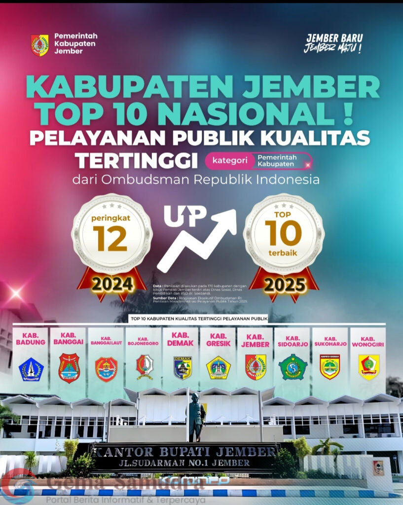 Jember, Gemasamudra.com – Pemerintah Kabupaten Jember kembali menorehkan prestasi nasional dengan masuk 10 besar pemerintah kabupaten terbaik dalam penilaian pelayanan publik oleh Ombudsman RI Tahun 2025. Dalam penilaian terhadap 170 kabupaten se-Indonesia, Jember berhasil menempati peringkat ke-7 nasional dengan opini “Pelayanan Publik Kualitas Tertinggi”.