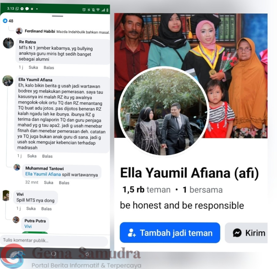 Jember, Gemasamudra.com Polemik terkait kasus dugaan bullying yang terjadi di salah satu Madrasah Tsanawiyah (MTs) di Kabupaten Jember terus bergulir. Di tengah upaya penyelidikan dan klarifikasi, muncul pernyataan dari salah satu akun media sosial bernama Ella Yaumil Afiana diduga Oknum Guru MTSN 1 Jember yang menimbulkan reaksi dari kalangan jurnalis.
