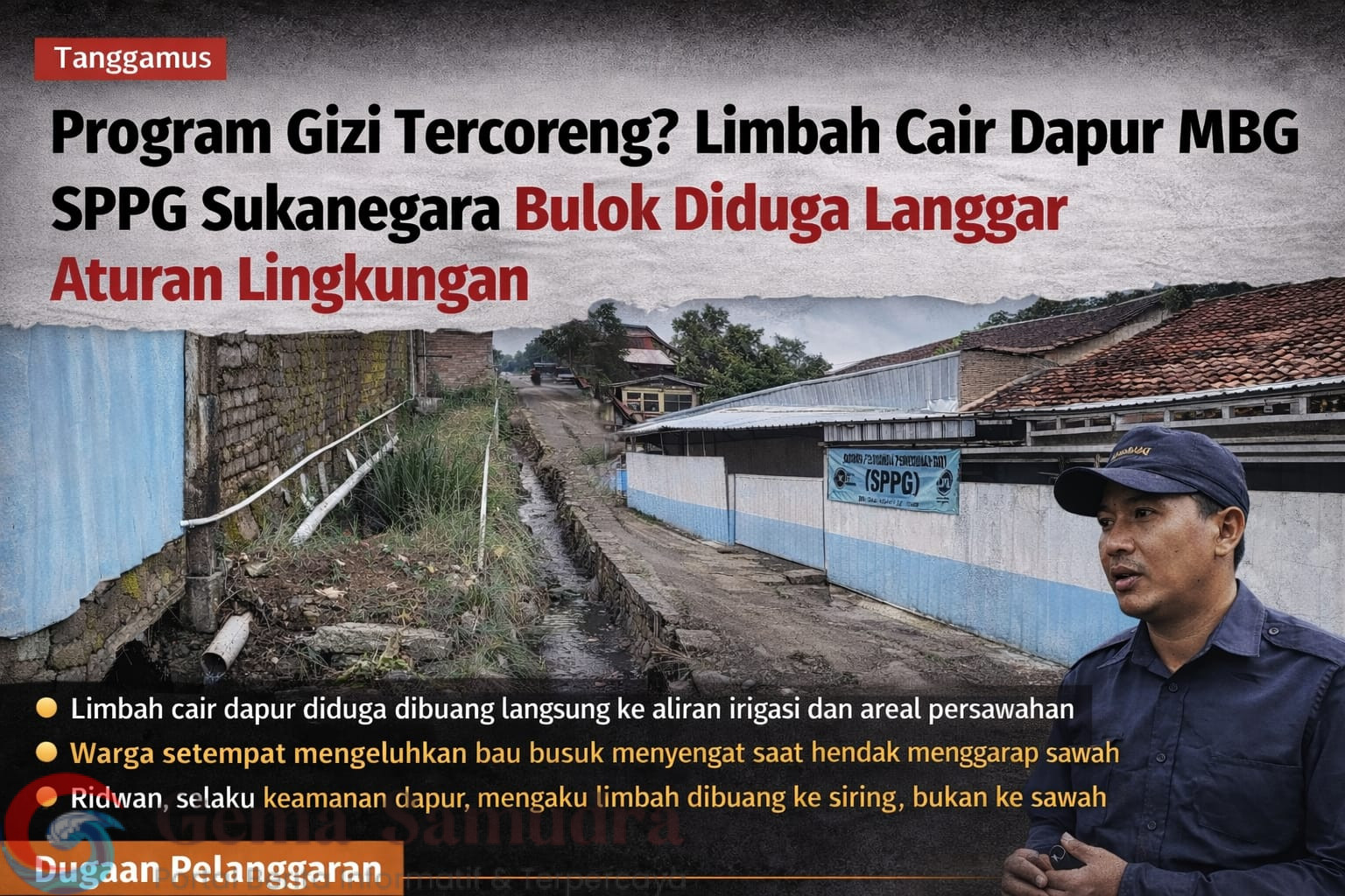 TANGGAMUS (GS) – Aktivitas dapur program Makan Bergizi Gratis (MBG) di Satuan Pelayanan Pemenuhan Gizi (SPPG) Sukanegara, Kecamatan Bulok, Kabupaten Tanggamus, menuai sorotan. Limbah cair dari dapur tersebut diduga dibuang langsung ke aliran irigasi dan areal persawahan warga tanpa pengolahan memadai.
