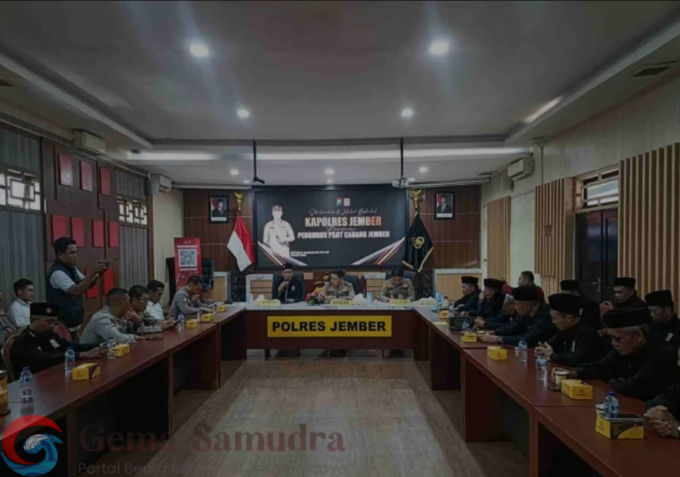 Jember, Gemasamudra.com – Polres Jember terus memperkuat sinergi dengan organisasi masyarakat, salah satunya Persaudaraan Setia Hati Terate (PSHT) Cabang Jember, melalui kegiatan silaturahmi dan halal bihalal yang digelar pada Rabu (15/4/2026) di ruang Rupatama Polres Jember.
