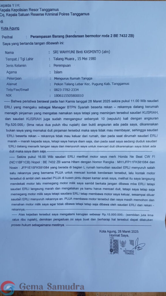 Tanggamus – Kembali terjadi tindakan arogan oknum dalam penagihan hutang pada nasabah, kali ini perilaku arogan ala deb colektor dilakukan oleh beberapa petugas BTPN Syariah terhadap warga Pekon Talang Lebar, Kecamatan Pugung, Lampung beberapa waktu lalu. (19/04/25)