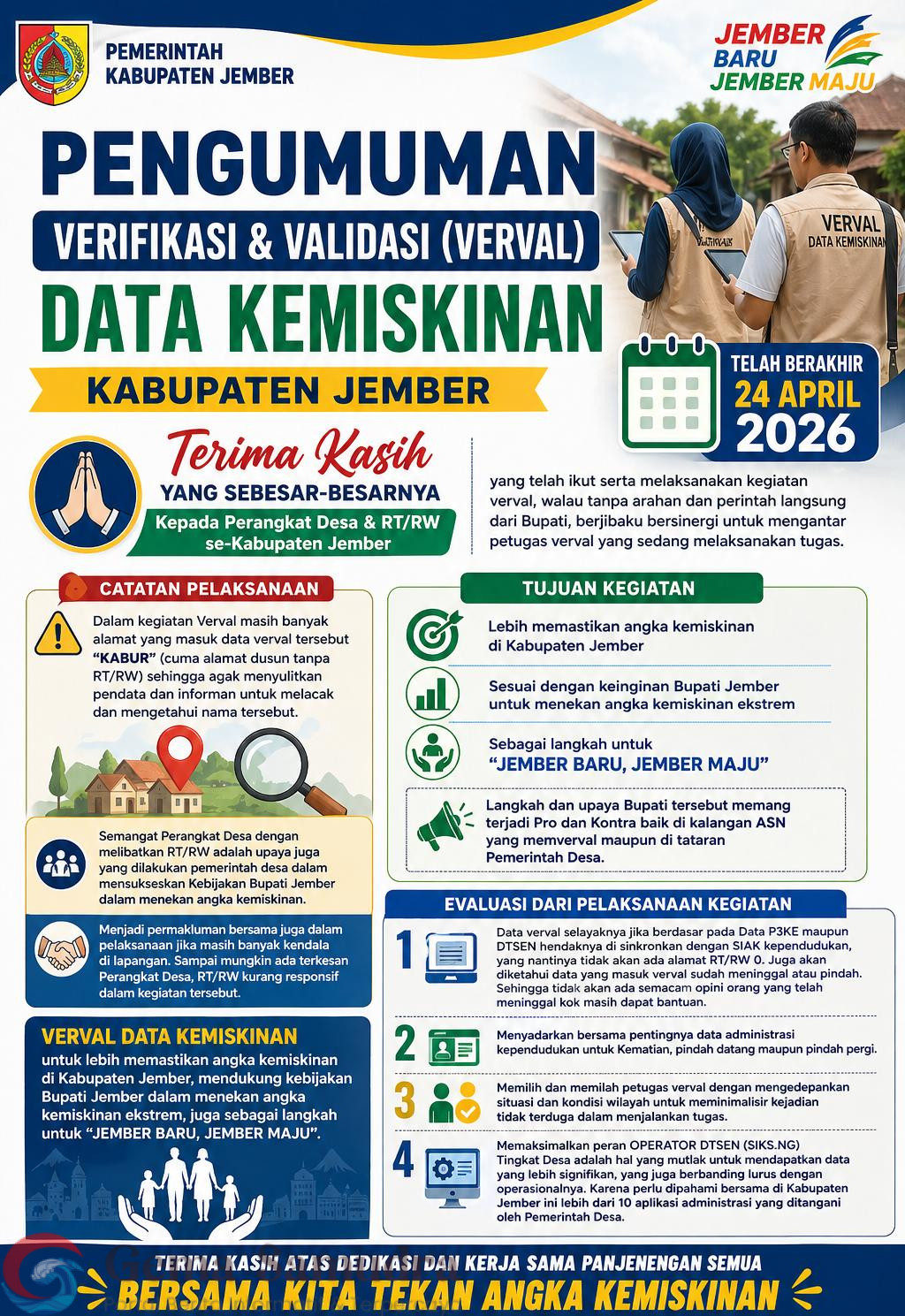 Jember, Gemasamudra.com – Kegiatan verifikasi dan validasi (verval) data kemiskinan yang dilaksanakan Pemerintah Kabupaten Jember dengan melibatkan Aparatur Sipil Negara (ASN) resmi berakhir pada 24 April 2026. Pelaksanaan kegiatan ini mendapat apresiasi dari berbagai pihak, khususnya kepada perangkat desa serta RT/RW se-Kabupaten Jember yang turut aktif mendampingi proses pendataan di lapangan.